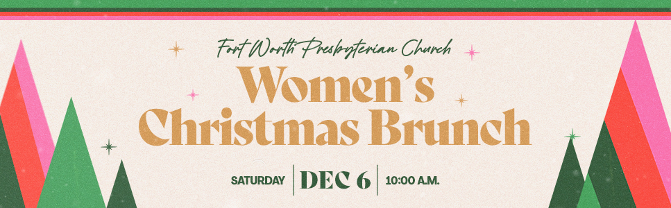 FWPC Women's Ministry invites you and your friends to a Christmas Brunch on Saturday, December 6 from 10:00-noon at Fort Worth Presbyterian (6251 Oakmont Trail). Rebecca York will be speaking, and we can't wait to share this special time with you!
